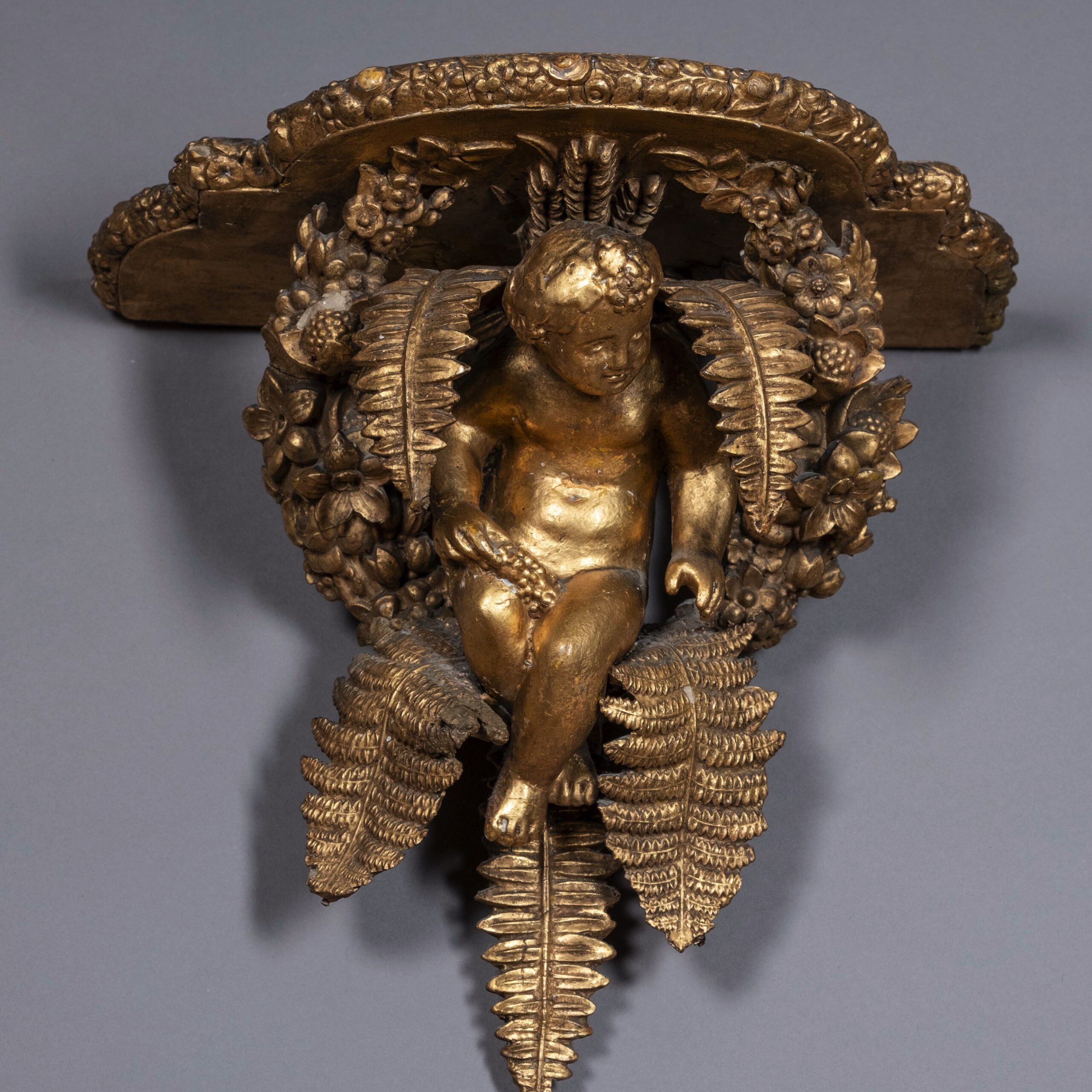 A pair of mid-nineteenth century Victorian Period gilded wall brackets, the shaped shelves supported by cherubs, ferns and floral garlands.