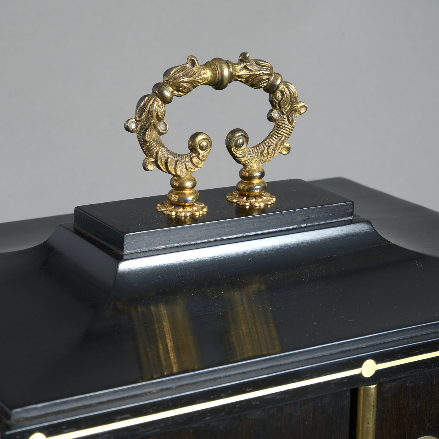 Standing on turned ebony feet with brass inlay and surmounted by a top quality chased ormolu carrying handle in the manner of George Bullock.