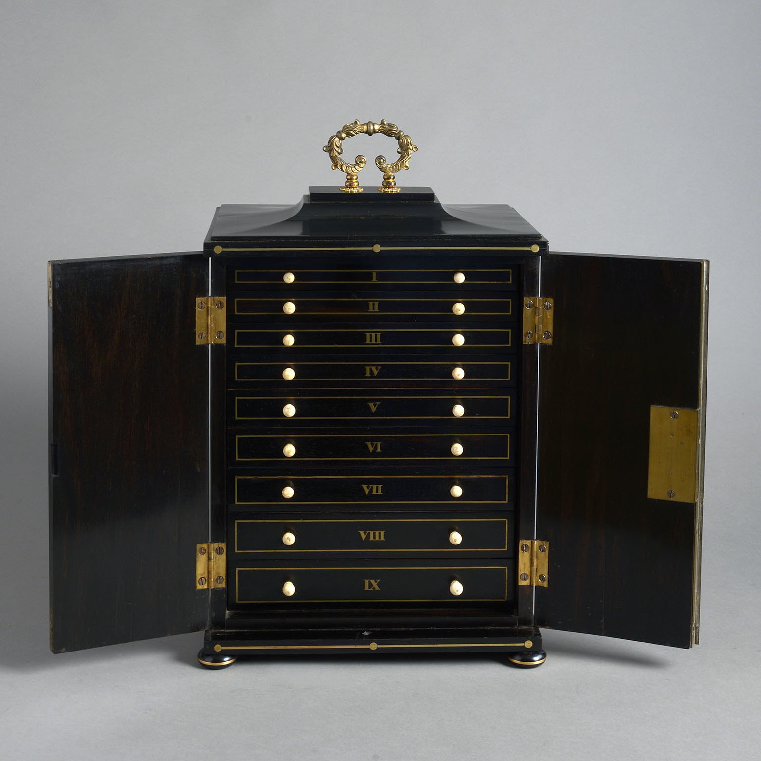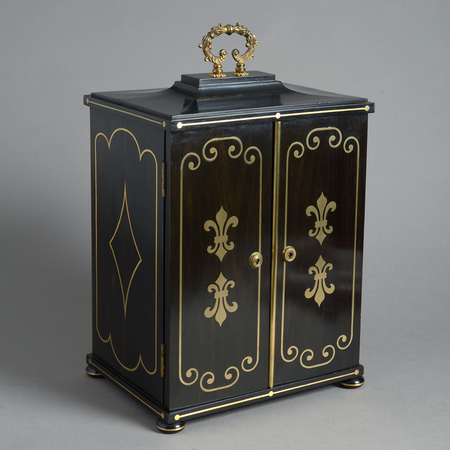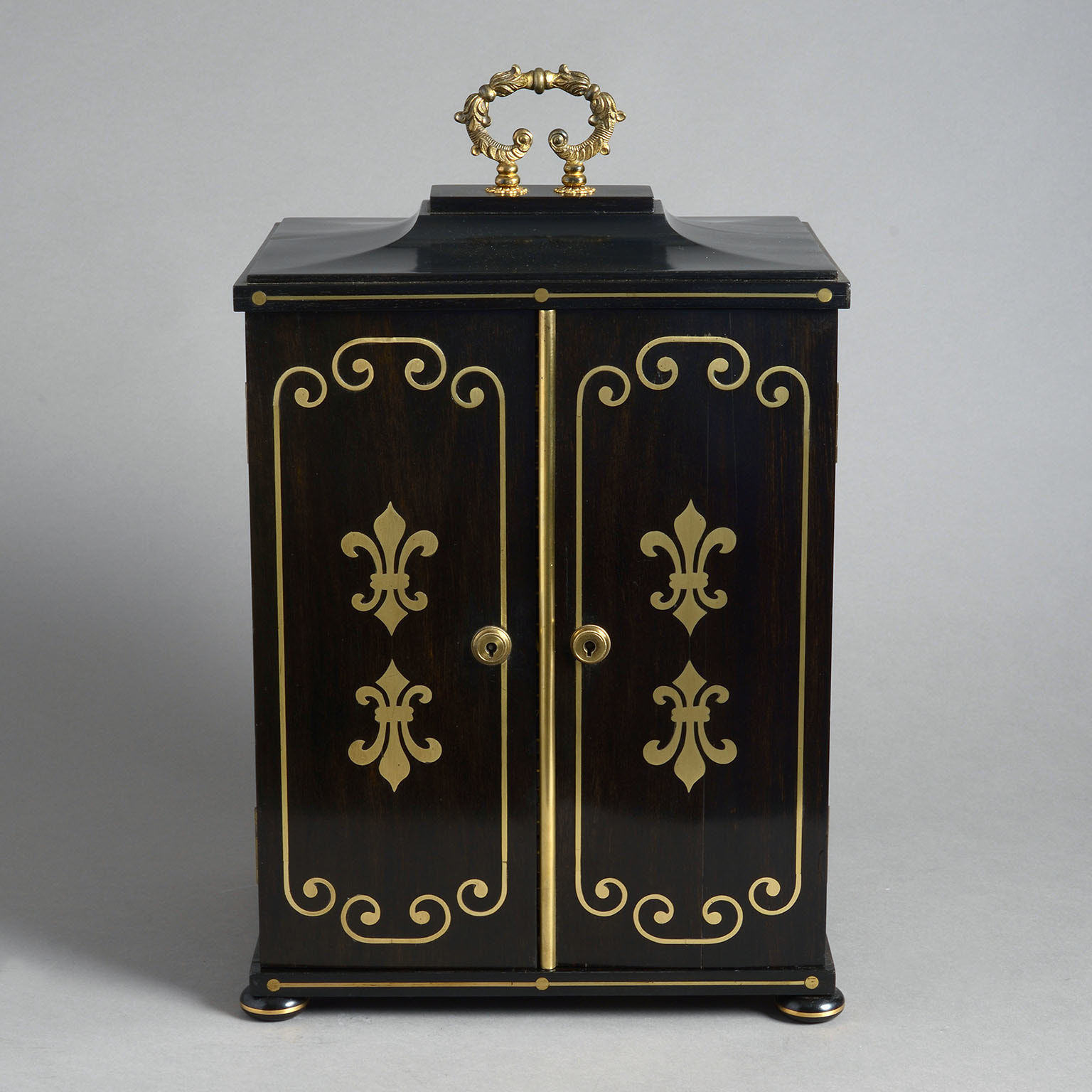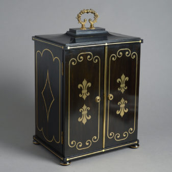 A Regency Ebony & Brass Inlaid Collector’s Cabinet constructed in a combination of solid ebony and veneered ebony over a mahogany substrate and decorated on all sides with brass inlay.