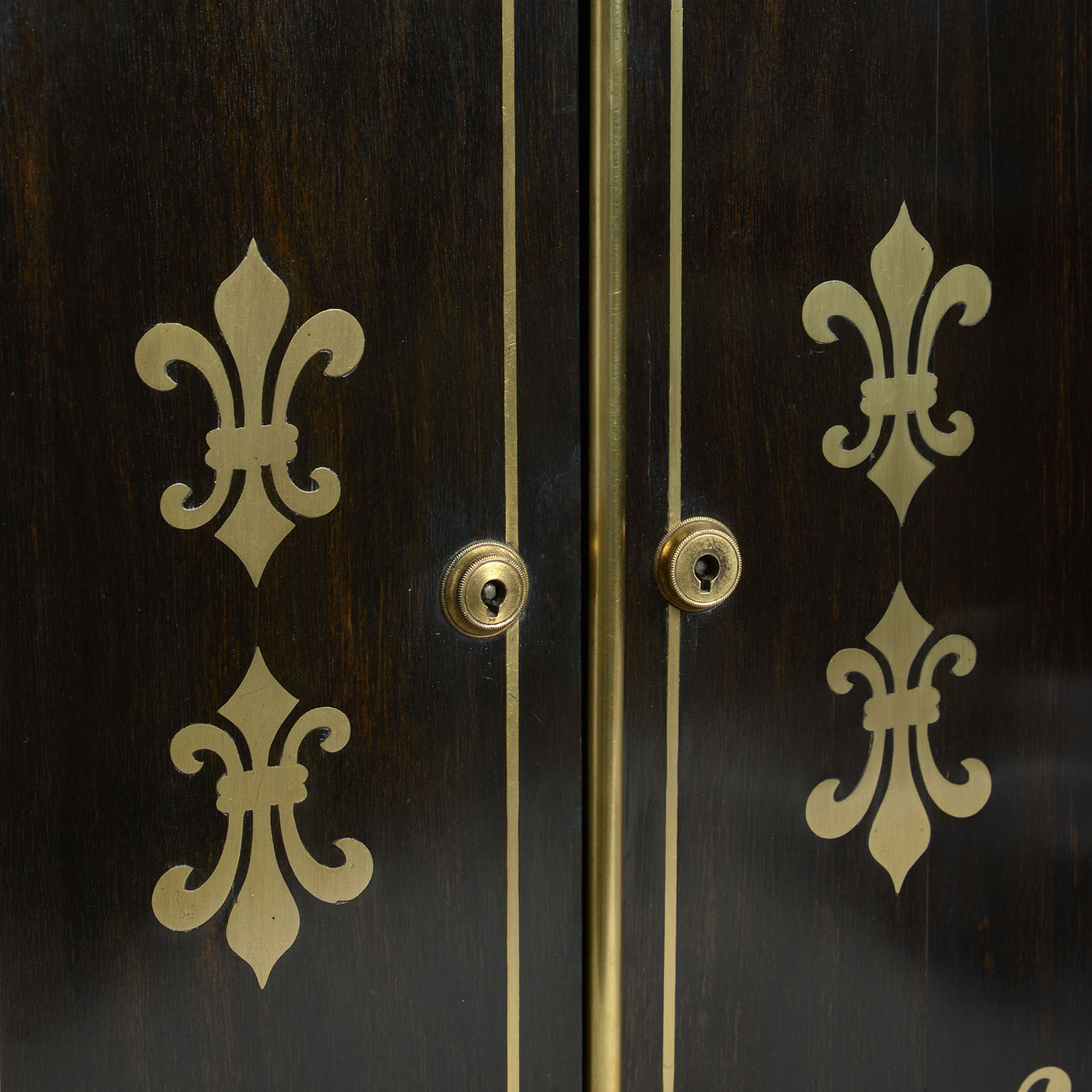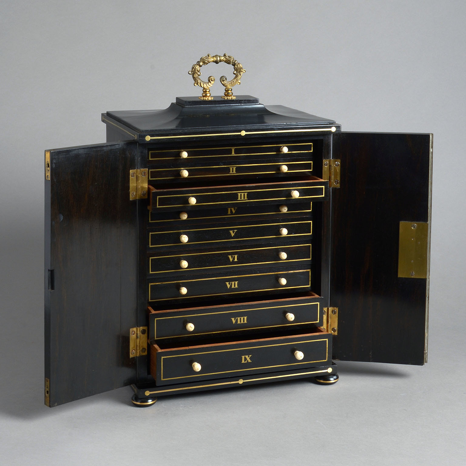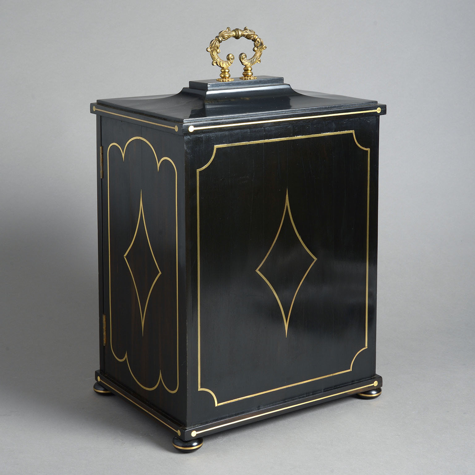 A Regency Ebony & Brass Inlaid Collector’s Cabinet constructed in a combination of solid ebony and veneered ebony over a mahogany substrate and decorated on all sides with brass inlay.