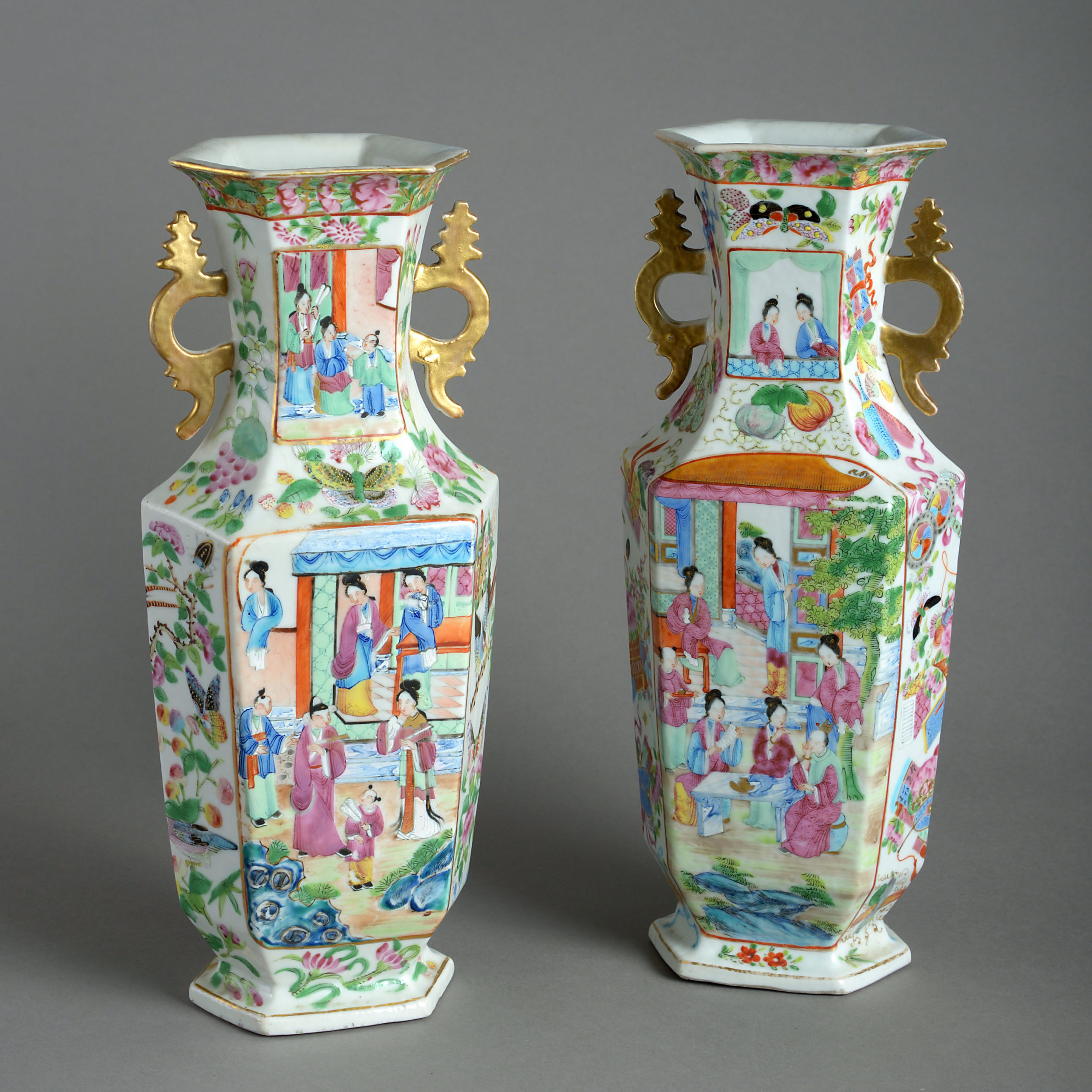 A pair of small scale famille rose Canton porcelain vases, having gilded side handles and decorated throughout with figurative cartouches.