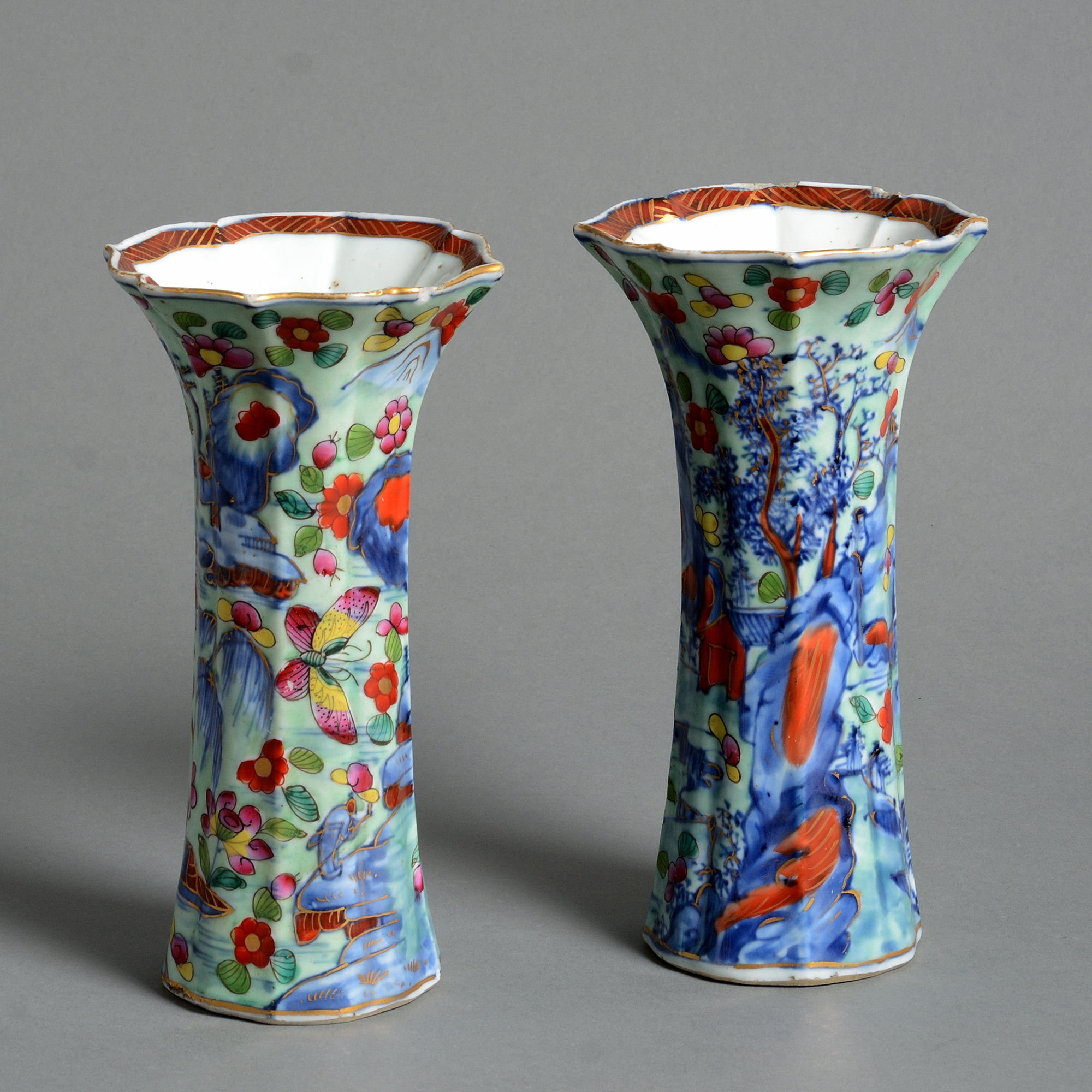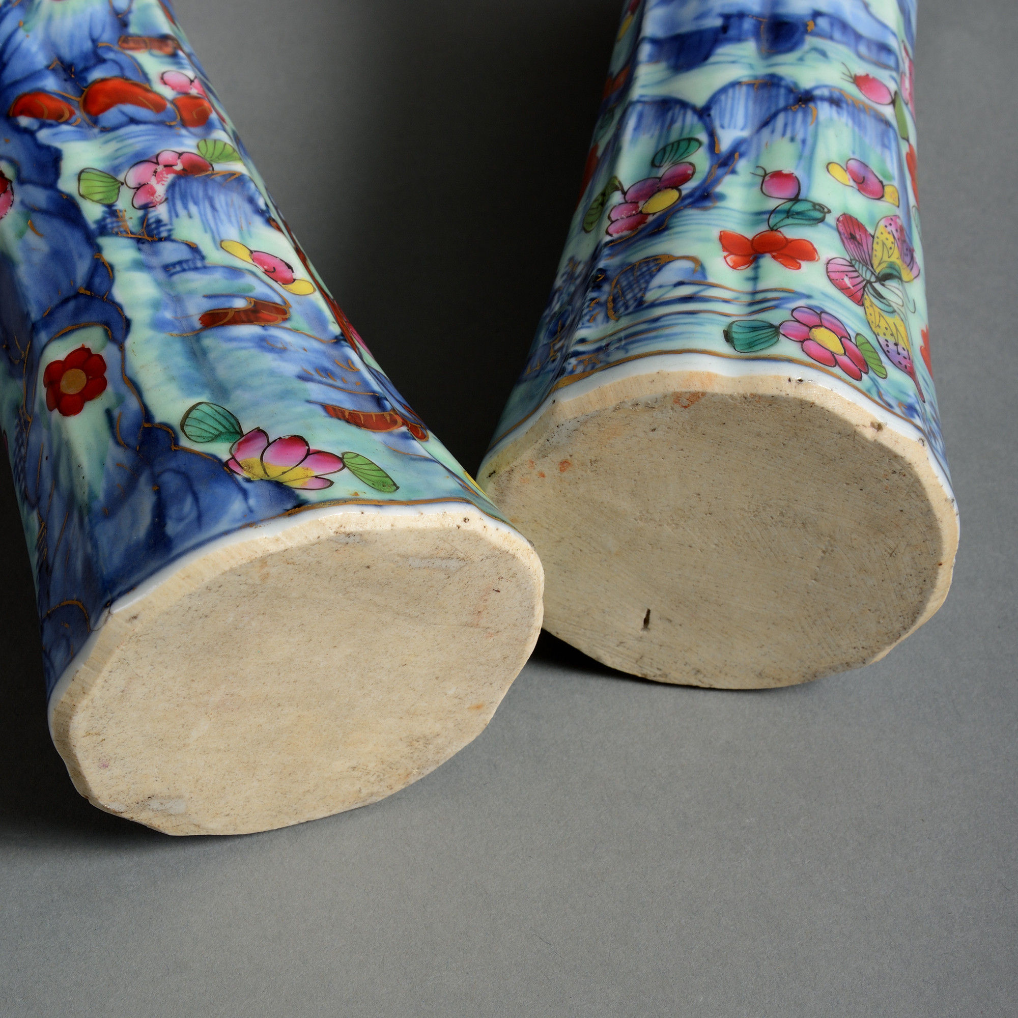 A fine pair of late 18th century porcelain trumpet vases with clobbered decoration throughout.