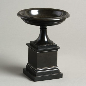 A tazza is a shallow, often wide saucer on a stem or foot, traditionally used for serving small foods, drinking or for decorative purposes. One of the most famous tazzas known to archaeologists, the Farnese Cup, stems from the 2nd century BC and currently resides in the National Archaeological Museum in Naples. This form was much copied throughout the classical revivals of the 17th, 18th and 19th centuries. This example in black marble has a gloriously pure form which relates entirely to known objects of Classical antiquity.