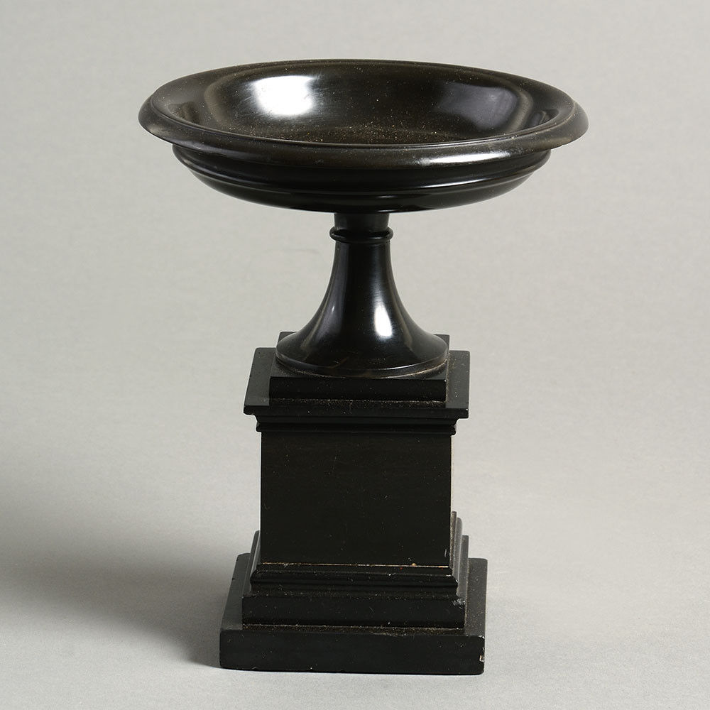 A fine black marble tazza of exceptional quality and condition, the turned upper section set upon a square stepped plinth.