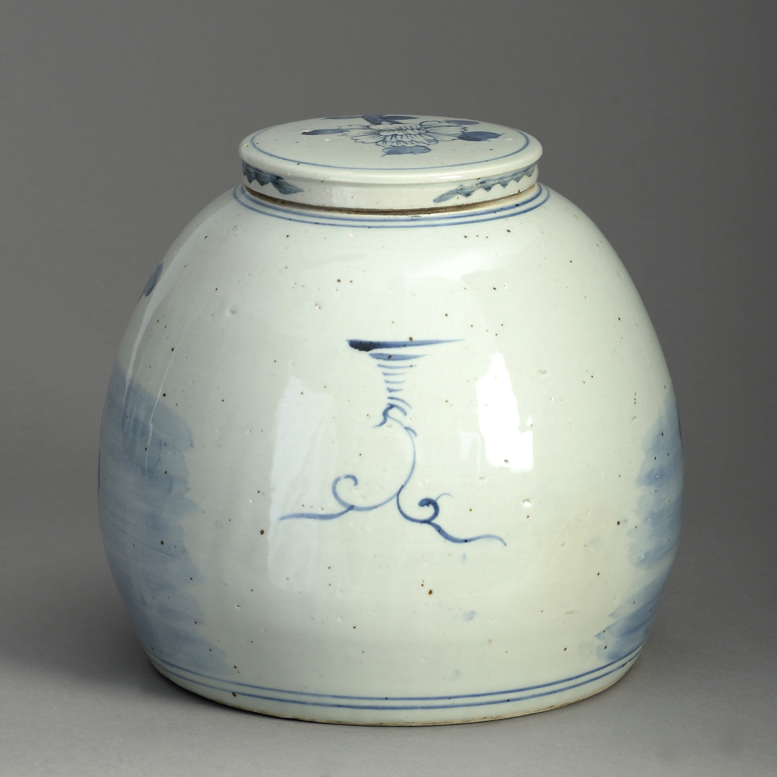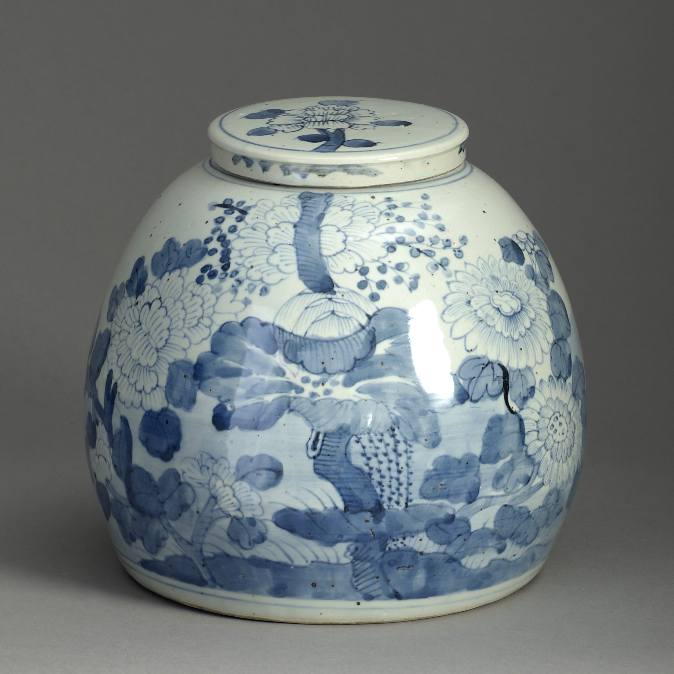 A most unusual mid-nineteenth century blue and white porcelain ginger jar of squat form, the flat lid and body decorated with a stylised chrysanthemum.
