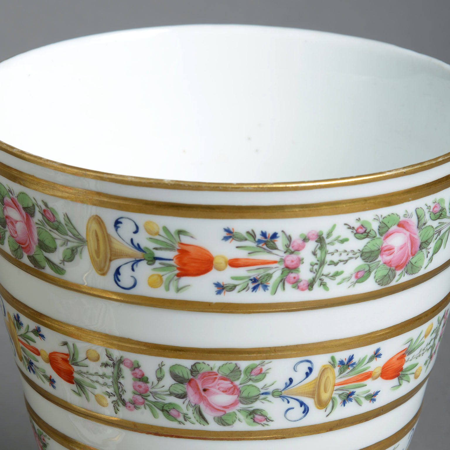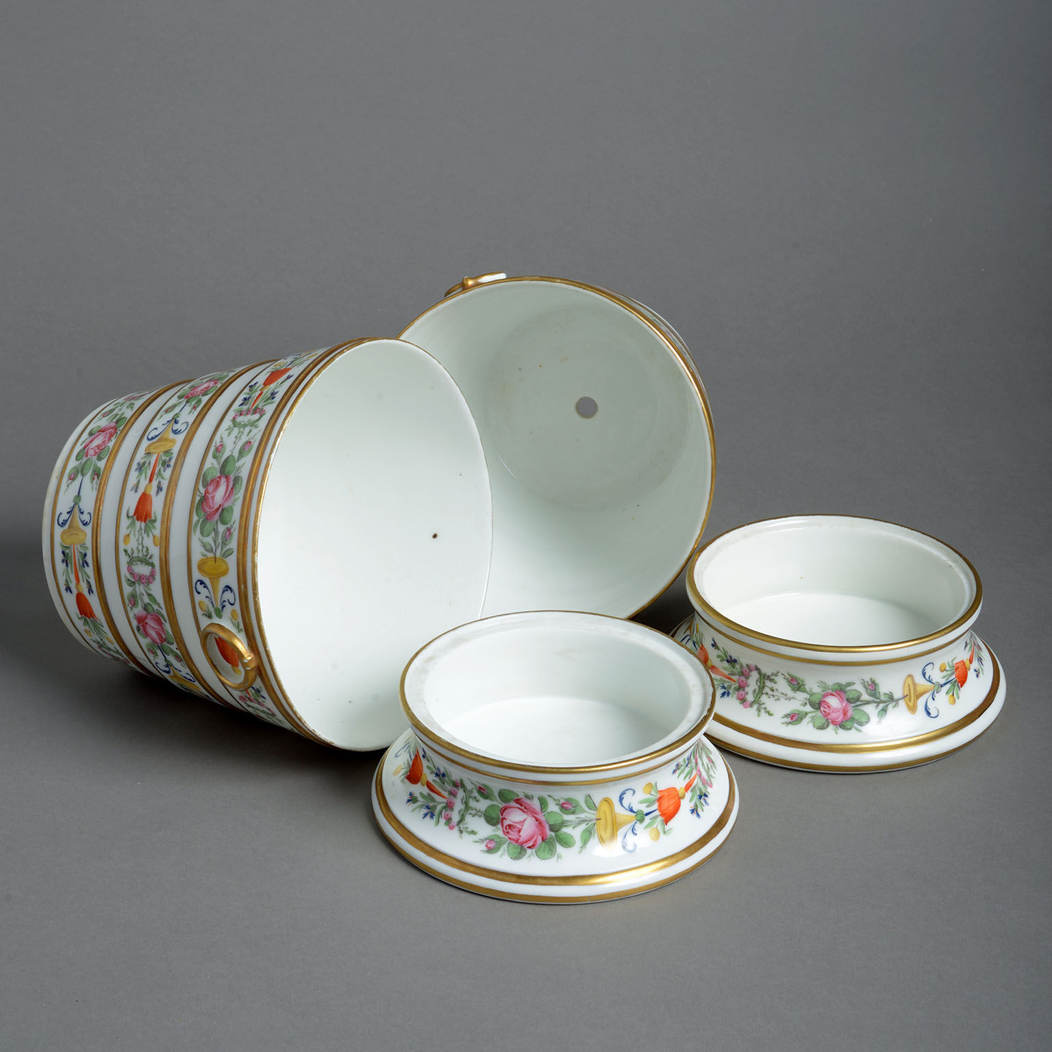 The flared forms delicately painted with bands of summer flowers within borders of gilding and with moulded loop handles.