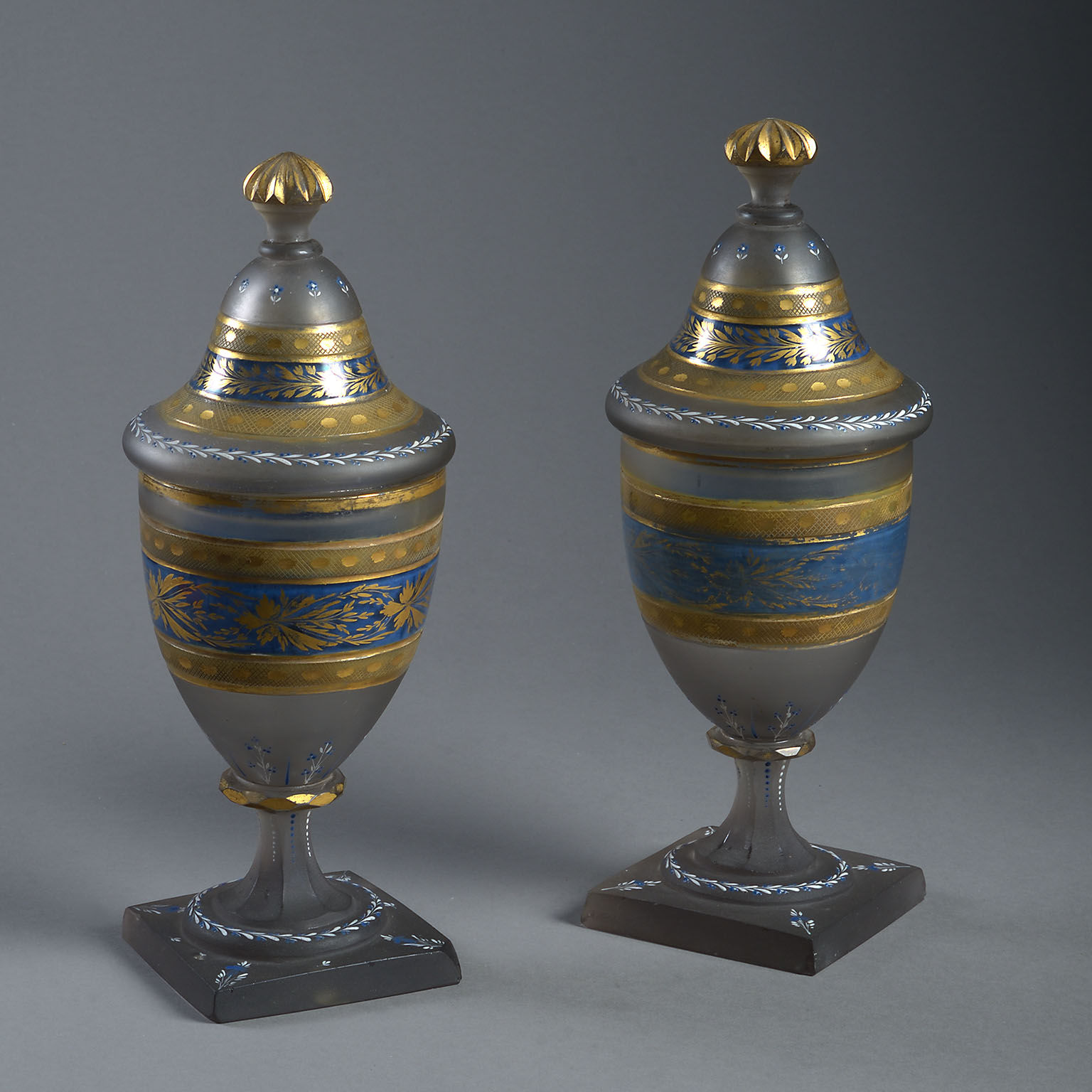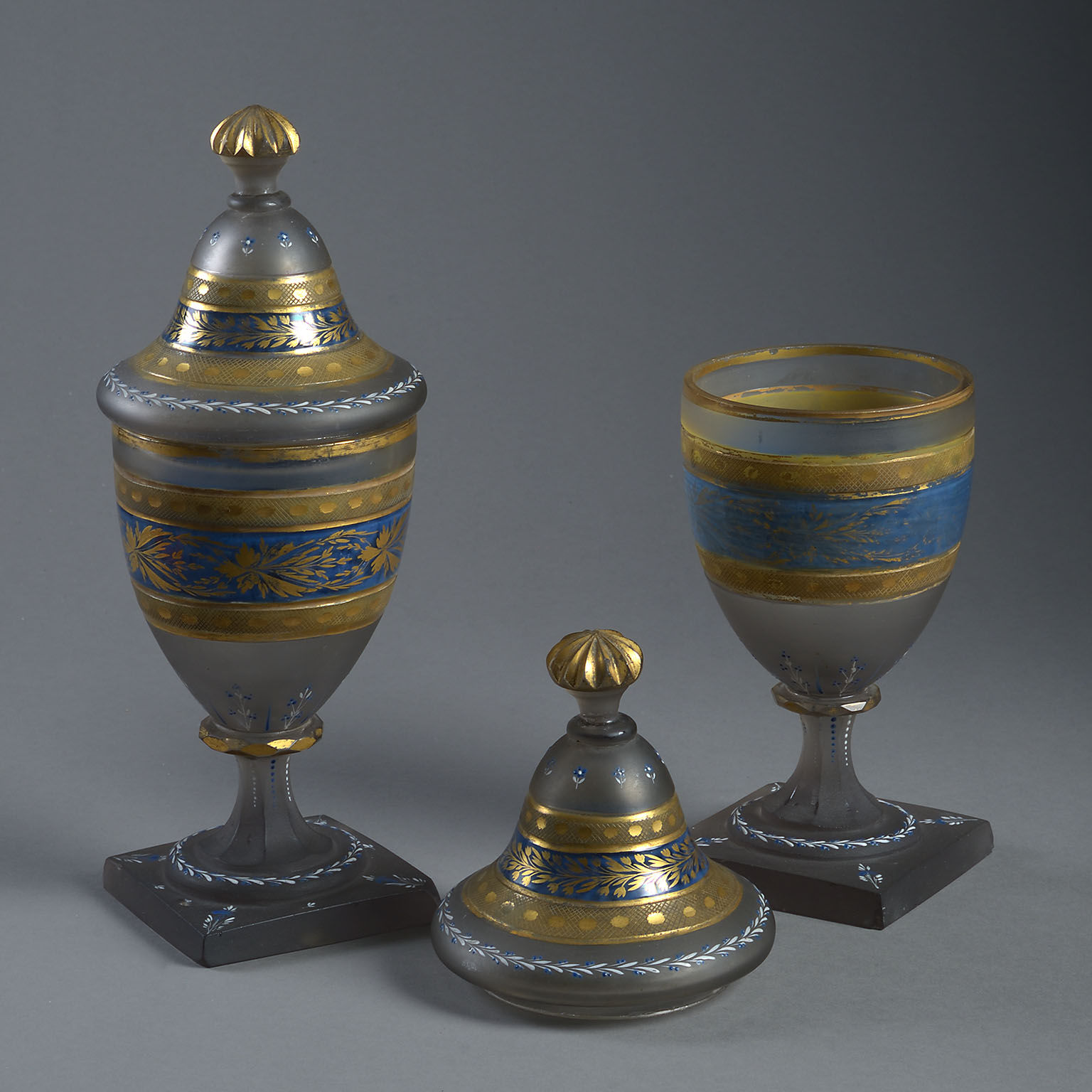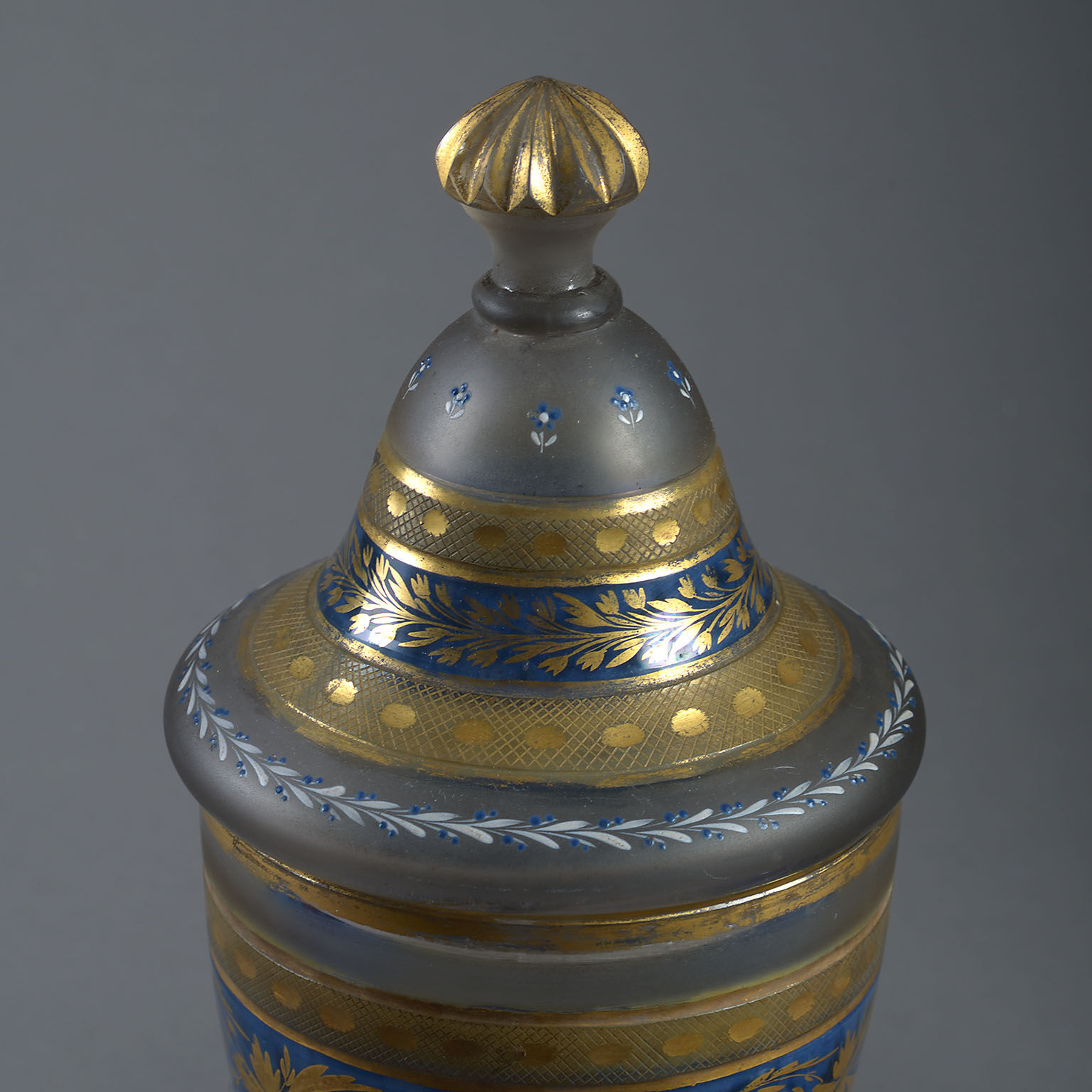 The urn shaped form decorated with bands of engraved and gilt foliage on a frosted and partly blue-painted ground.