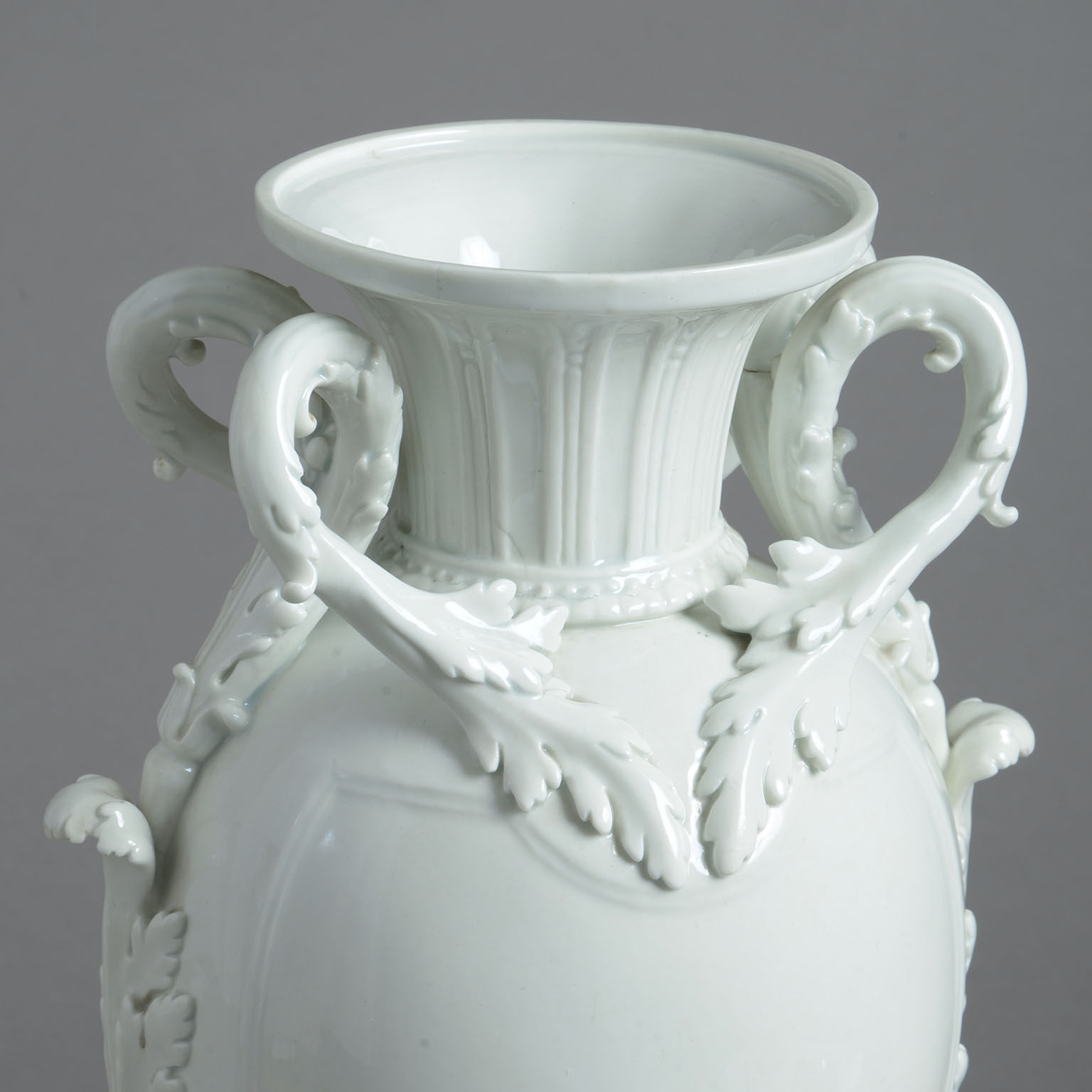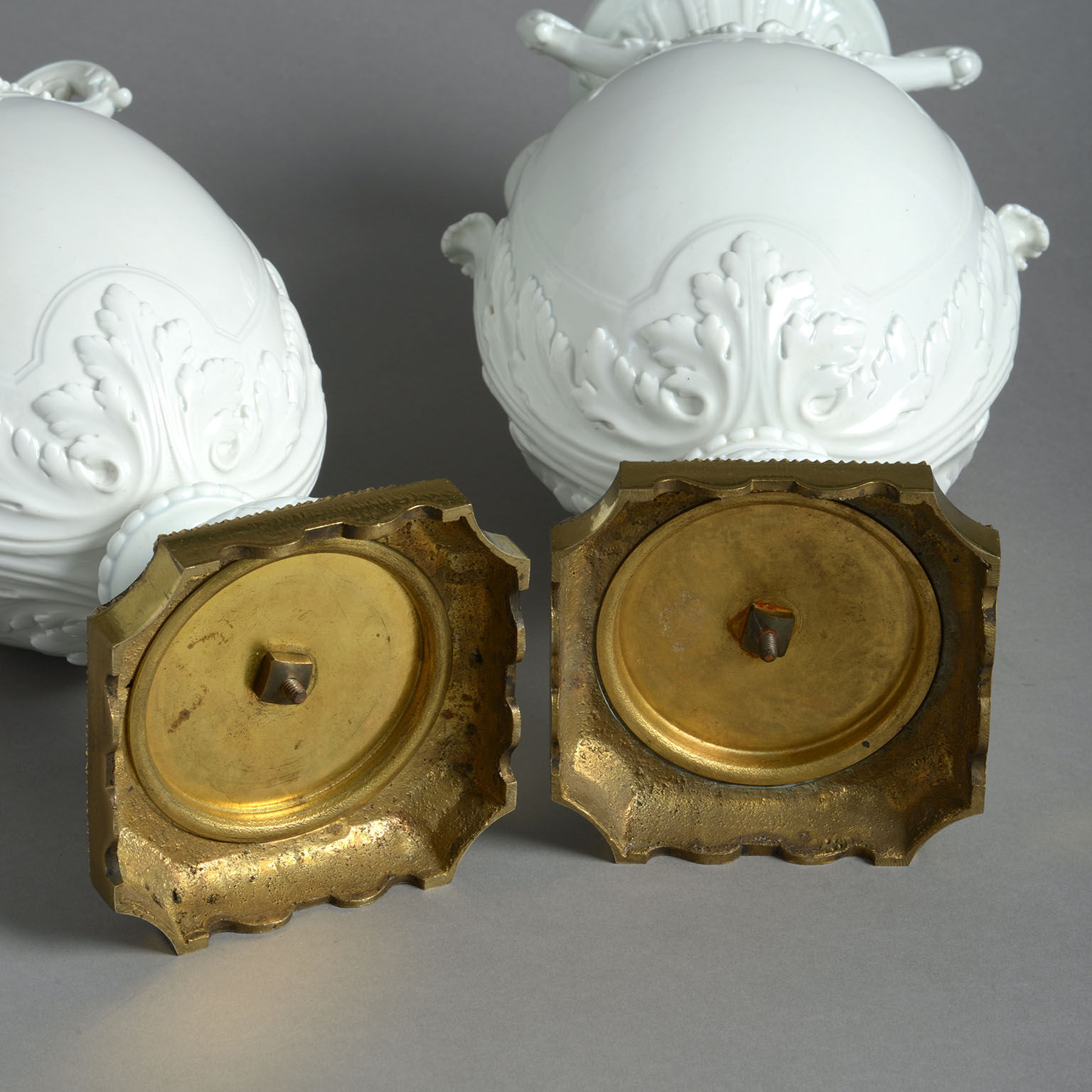 The white-glazed bodies of ovoid form applied with with acanthus handles, standing on flared, spiral-moulded bases and raised on gilt-bronze stands.