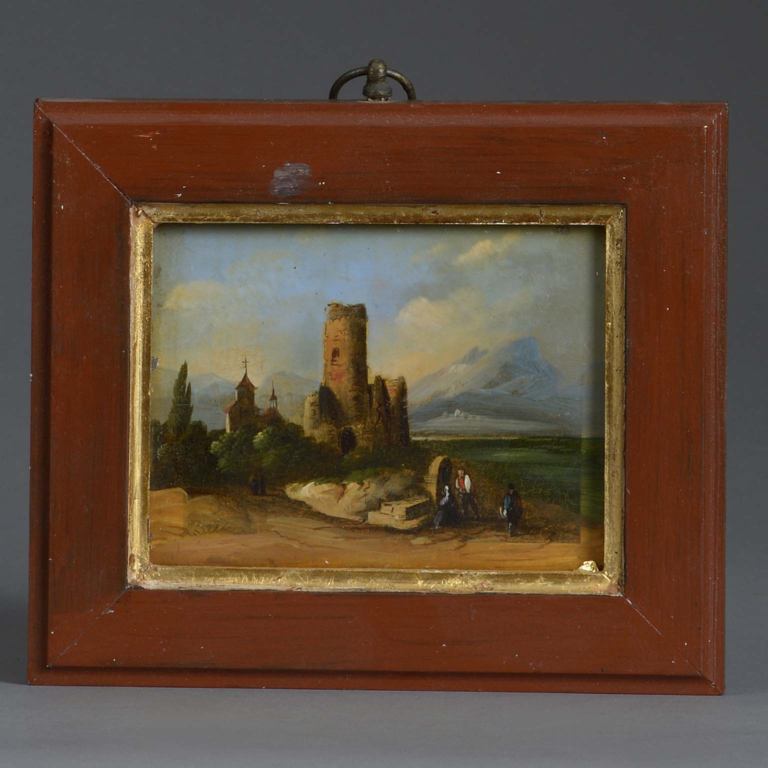 A pair of nineteenth century oils, of small size, one depicting a fort by a lake; the other a coastal storm and shipwreck. Housed in painted frames.