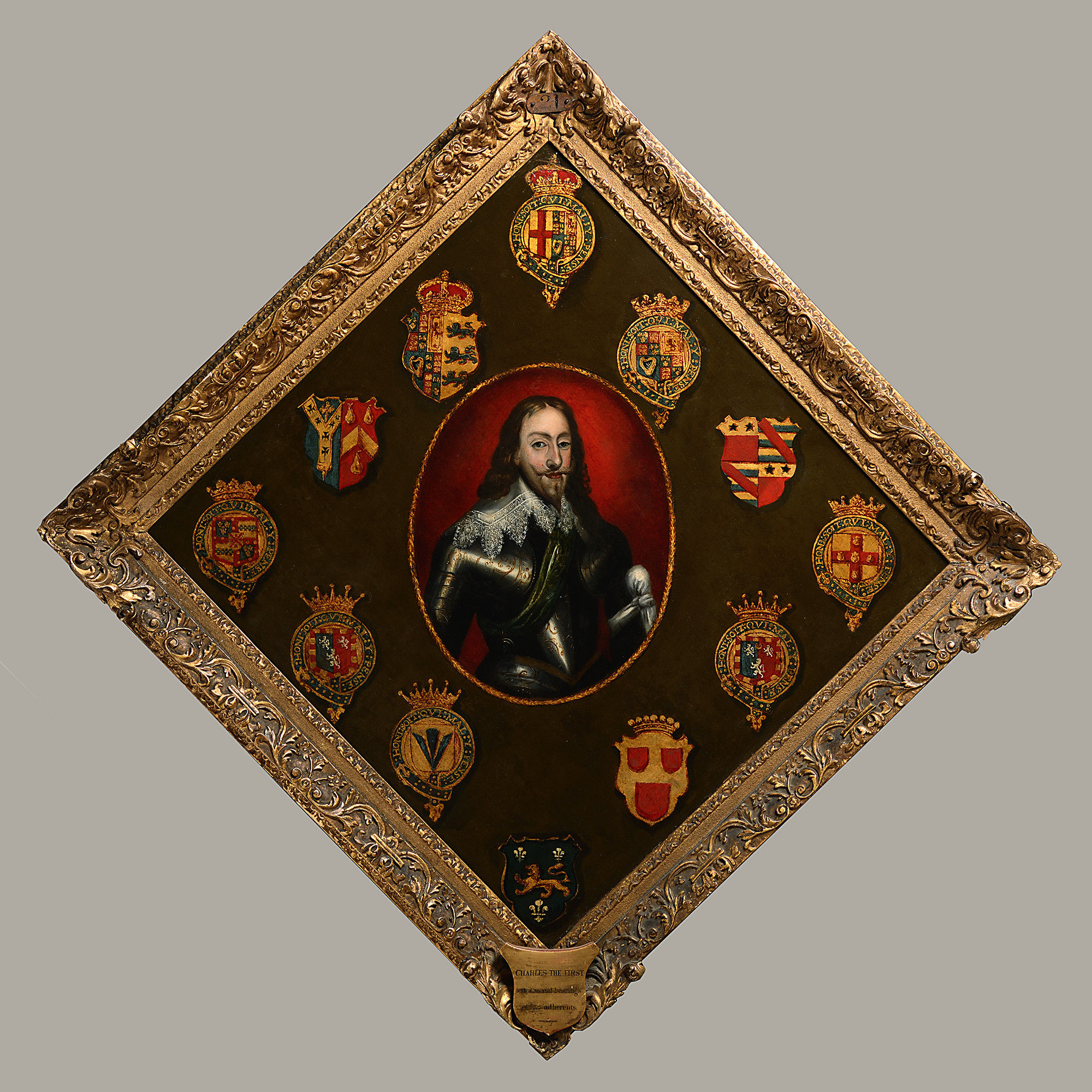 An early 18th century lozenge shaped portrait depicting Charles I and the armorials of his supporters. Set within a carved gilt wood frame.
