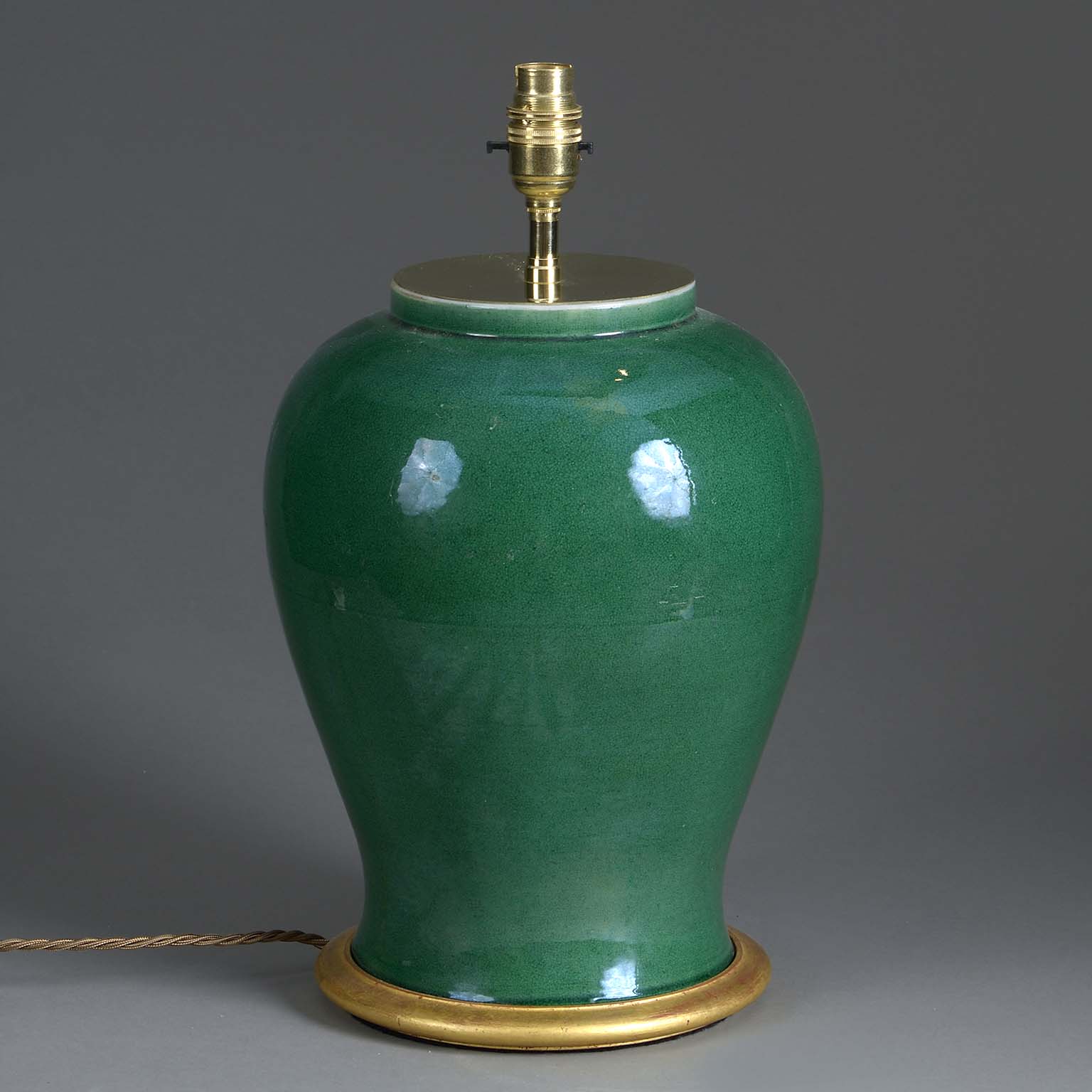 An early twentieth century green glazed jar of baluster form, mounted upon a turned gilded base as a table lamp.